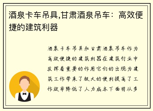 本文将对滨卅二手吊车-滨卅二手吊车的品质保障和价格实惠进行详细阐述。我们将介绍该二手吊车的品质保障措施,包括质量检测、维护保养等方面;我们将分析其价格实惠的原因,包括成本控制、售后服务等方面。我们将对滨卅二手吊车-滨卅二手吊车的品质保障和价格实惠进行总结归纳。 品质保障措施 滨卅二手吊车-滨卅二手吊...
